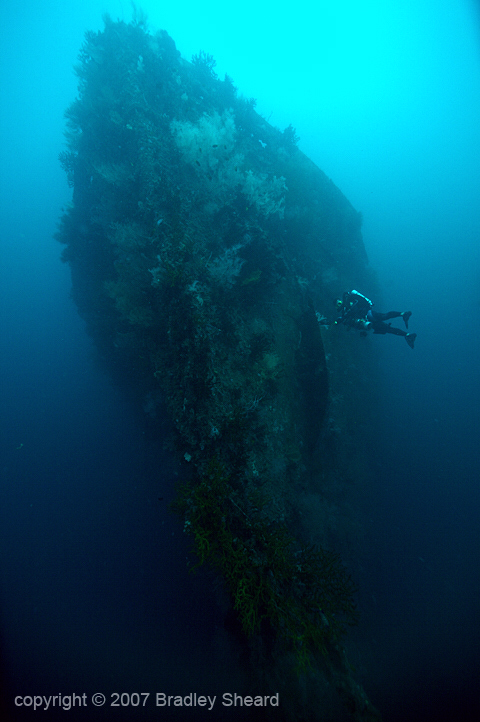 | USS Minneapolis, minus her bow, after the "Battle of Tassafaronga." | The Minneapolis' bow now rests upside down at the back of Tulagi Harbor. | The wreck of the Tama Maru is blessed with incredible visibility. |