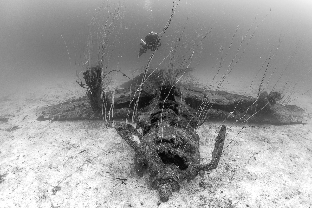 At the foot of the bow on the port side sits the tail section of an aircraft, including the tail landing gear and either the horizontal or vertical stabilizer, minus the rudder/elevators. The tail landing gear is in place, although covered in quite a bit of marine growth. There are only three reasonable possibilities for the identity of this tail section. On board the Saratoga during the Baker blast were six aircraft on the flight deck, three Curtiss SBF-4E Helldivers and three Grumman TBM-3E Avengers. A third possibility, which is a bit of a wildcard, is the possibility that it is a Grumman F6F-5 Hellcat. While there were no Hellcats on board the Saratoga during the Baker blast, 4 Hellcats were aboard the USS Independence during the Able blast. Two were on the flight deck and were reported as missing, blown overboard, after the blast. Two were on the hanger deck and reported as “completely demolished” with the fuselage broken aft of the cockpit, and were “jettisoned.” Note that after the Able blast, the Saratoga was repositioned quite close to where Independence was anchored during the Able blast, and it seems possible that Saratoga was coincidentally moored over this tail section, which could be an F6F Hellcat from the Independence.