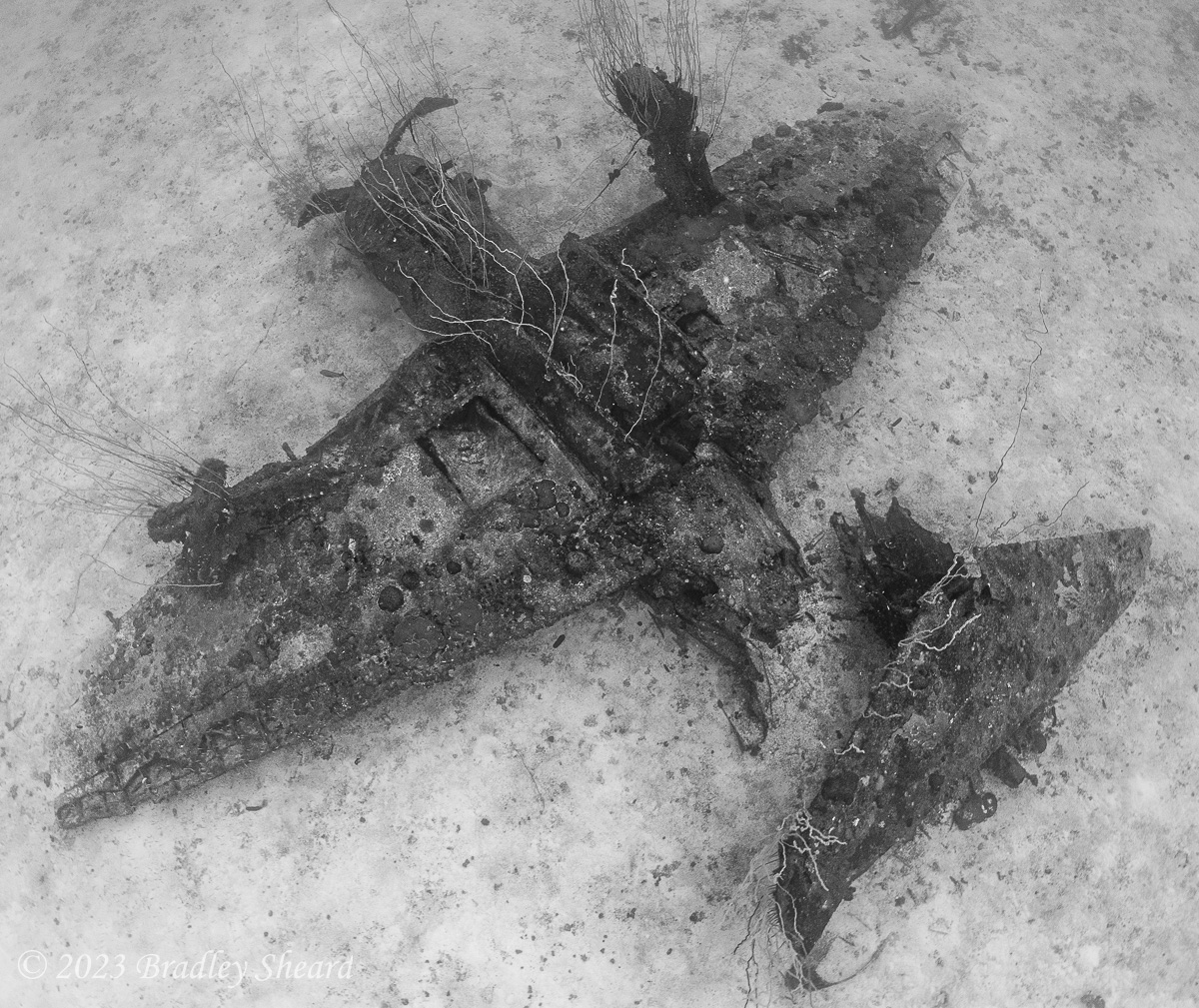 As time went on, Becky Kagan Schott introduced me to Brett Eldridge, who had been in Bikini several weeks after I had, and had constructed some fantastic 3D photometric models of the Saratoga's aircraft. We got to talking and comparing notes, and after much back-and-forth discussion and staring at pictures and schematics, finally came to the conclusion that this aircraft tail is actually from a Curtiss SBF-4E Helldiver. As it turns out, the "fin" present appears to be one-half of the horizontal stabilizer, with the other half covered with sand, and not the vertical fin of the aircraft. What I had thought was a landing gear door is apparently the front end of the Helldiver tail fairing; seen from the side (above the wreck) the tail wheel fairing seems to match almost perfectly with the Helldiver fairing, and the "fin" seems to match almost perfectly with the planform of the structural portion of the horizontal stabilizer of a Helldiver.