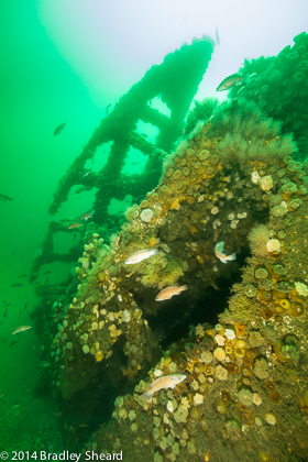 May 2014, Pt Pleasant NJ: Taking my new scooter to the World War II freighter Arundo, for the second week in a row we took in an entire wreck in a single dive. We anchored near the wreck's stern, only a stone's throw from the propeller, and proceeded to scooter all the way to her bow. Visibility was only so-so (the Arundo isn't renowned for spectacular visibility, sitting on the edge of the Mudhole), but good enough to operate the DPV and navigate well enough with a couple of well-placed strobes. The bow was particuarly interesting to see, for the last time I saw it was probably 20 years ago. I remember one dive in particular, diving off the old Sea Hunter. We anchored into the Arundo and found that the visibility from the surface to the top of the wreck was an astounding 50+ feet, unheard of for this wreck. The visibility dropped off to only 10 feet on the bottom, so there was this odd phenomenon where the highest parts of the wreck rose above the silty layer that looked like a visual version of a thermocline, protruding into a clear sea, while lower parts of the wreck were immersed in a pea soup of silt. The bow was one of those higher parts of the wreck that rose into the clear water. At the time it was far more intact than it is today, and while it listed over it was pretty much in one piece, and even had railings along the gunwale. I also remember a prominent anchor sitting in the hawsepipe. The visibility on the higher sections of the wreck was so spectacular that day, that I borrowed a roll of high-speed color print film (Kodacolor 1000) from Theano for the second dive, as I had no fast film. (High ISO options were rather limited in those days!) I tried to shoot available light images, but when I got the film back (you also had to wait a few days before you could see the results of your efforts then--digital photography is wonderful in so many ways) the golf-ball sized grain in the images was horrid! (Theano insists to this day that I yelled at her for giving me that film--but I'm skeptical of that!). After scootering all the way to the bow, it was like taking a trip back in time for me. But the wreck had changed so much since I had been here last! Hard over on its starboard side now, the stem was intact and obvious, along with that same anchor I remembered from years ago, still sitting in its hawsepipe. The bow I remember had a definite list, but it has apparently fallen almost completely over on its side since then, and is not nearly as majestic as it once was, and seems almost tiny in comparison to my memory of it. In some ways it is hard to believe that this is the bow of a once-great ship.