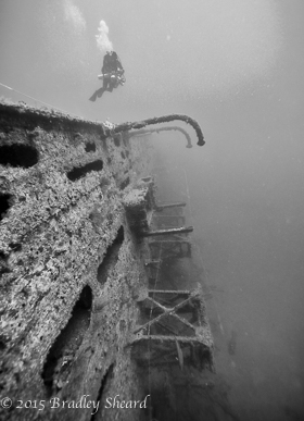 | Joe Mazraani scooters along the stern section of the "Terror Wreck," a shipwreck whose identity has never been positively determined. | Starboard side of the USS St. Augustine, a World War II convoy escort sunk in a collision on January 6, 1944 with a large loss of life. |
