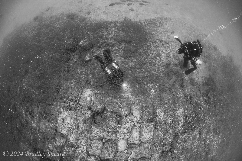 | The FW Abrams was a "friendly-fire" casualty of the same global war as many of the wrecks we dive off Hatteras, as she had a fatal encounter with an Allied minefield. Today she is largley flattened and increasingly buried beneath the shifting sands. The highest part are her three boilers (top), and the remains of her steam engine. The engine was engulfed in a mesmerizing cloud of swarming anchovies that were in constant movement as they surged over and around the engine like a giant bird murmuration (bottom row). |