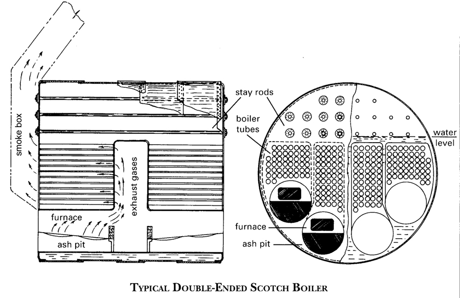 As the design of marine power plants developed during the second half of the nineteenth century, boiler design grew more sophisticated. Ship designers required higher steam pressures in order to provide more efficient engines. In order to achieve those higher pressures, boilers changed from simple box-like structures into the more familiar cylindrical marine boiler—known as a "Scotch" boiler. A cylinder is a much more efficient shape for a pressure vessel than a flat-sided box, and allows the development of higher steam pressures without causing the boiler to burst. The lower half of a cylindrical boiler usually contained between two and four furnaces, where coal-stoked fires burned to heat water inside the boiler and change it into steam. It was soon discovered that additional heat energy could be drawn from the hot furnace gases that were a by-product of the coal fires. This was accomplished by venting the hot gas through a series of small tubes (boiler tubes) that passed back through the boiler before being exhausted out the familiar ship's smoke stack. These tubes can usually be seen on the flat ends of a cylindrical boiler, about midway up the face and above the large cylindrical furnace openings. | |