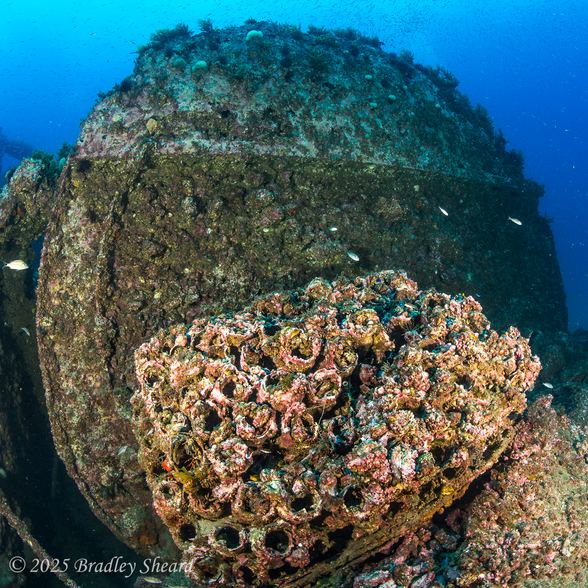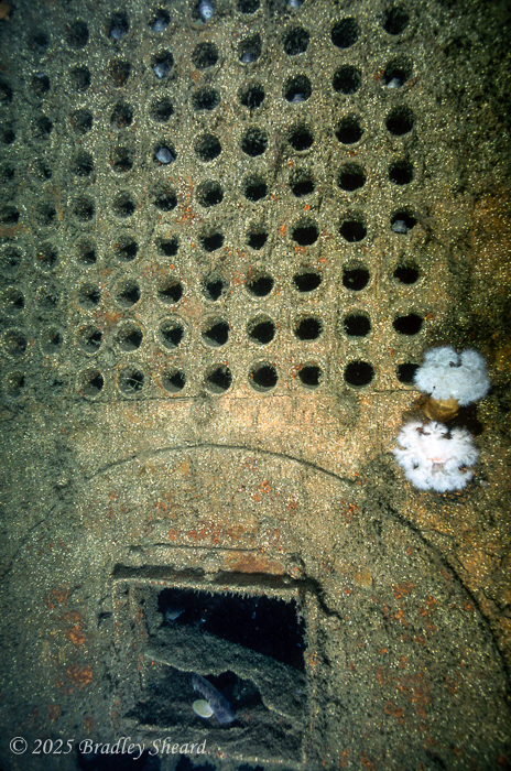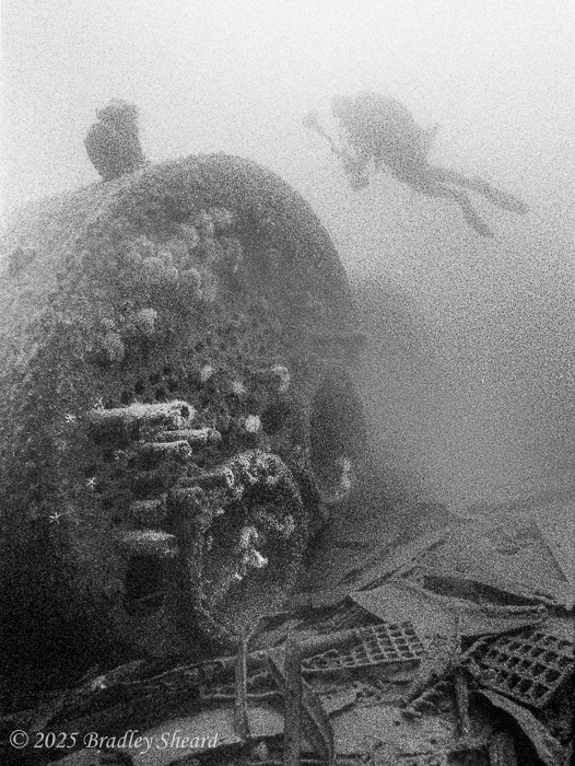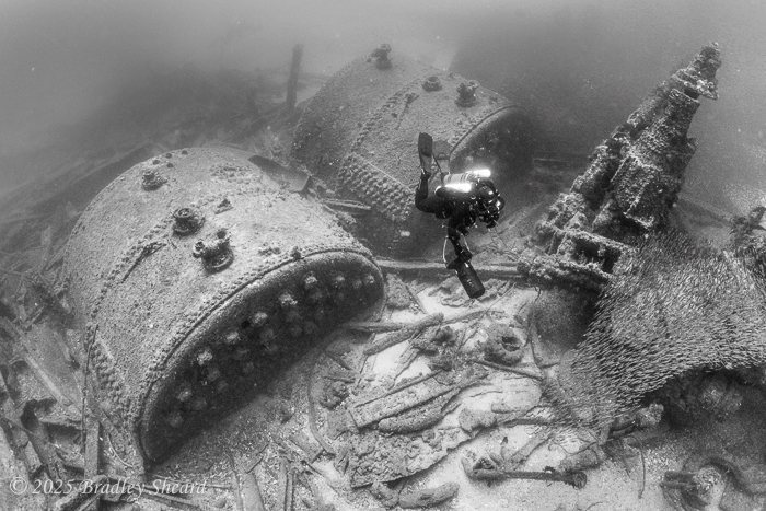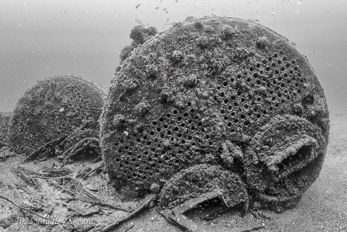 | The Texel was sunk by U-151 during WWI and today sits largely collapsed in 230 feet of water. Her boiler is relatively free of marine growth due to the depth, giving a very clear view of the boiler tube array above the furnace. What small marine creature could resist making its home in such and apartment complex? | The WWII freighter Manuela was not built with a classic set of round boilers and a triple-expansion steam engine like most of her contemporaries, but rather with a pair of Babcock and Wilcox watertube boilers (above) driving twin steam turbines geared to a single propeller. Rather than burning coal to produce steam, she burned bunker oil. | Sunk just outside the entrance to Boston Harbor in 1936, the excursion steamer Romance is largely broken down and scattered across a muddy bottom. One of the few remaining features of the wreck site, however, are her boilers. Note the boiler tubes protruding from the flat end of the boiler. |