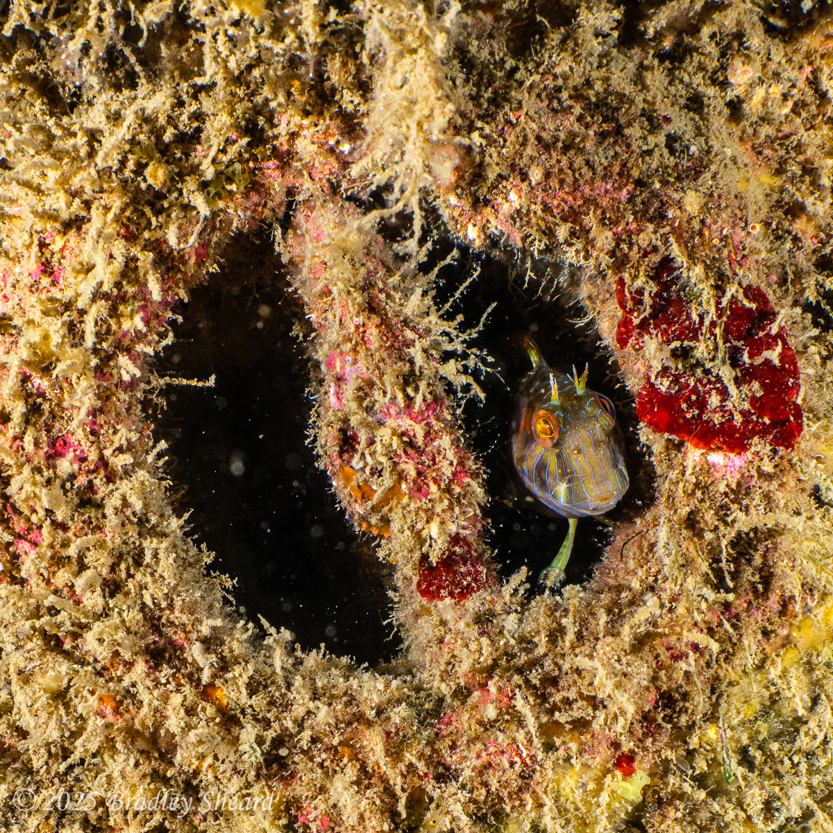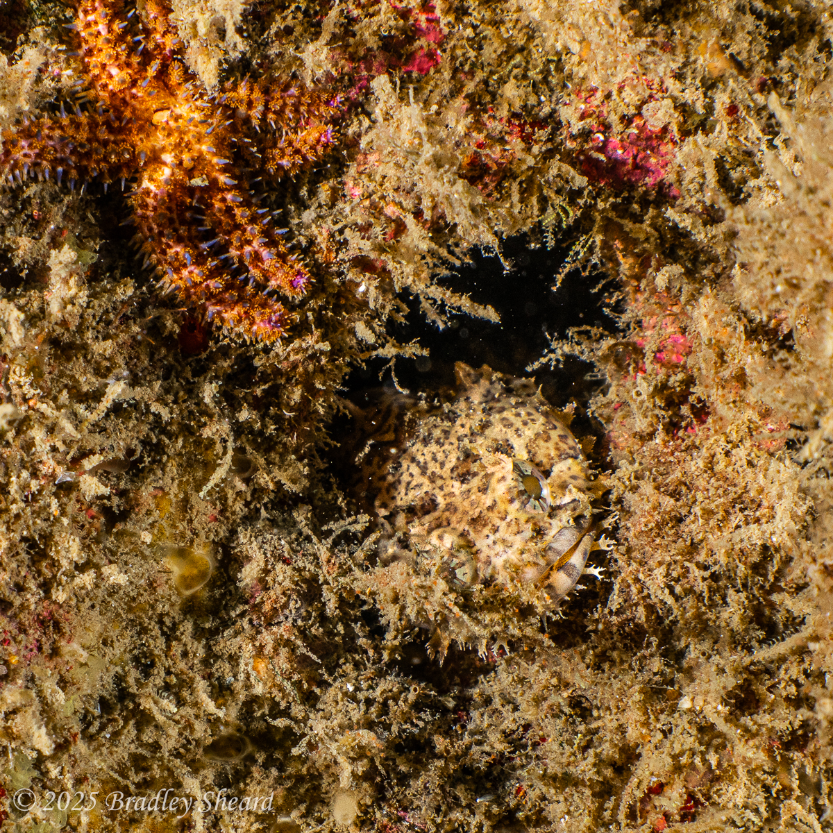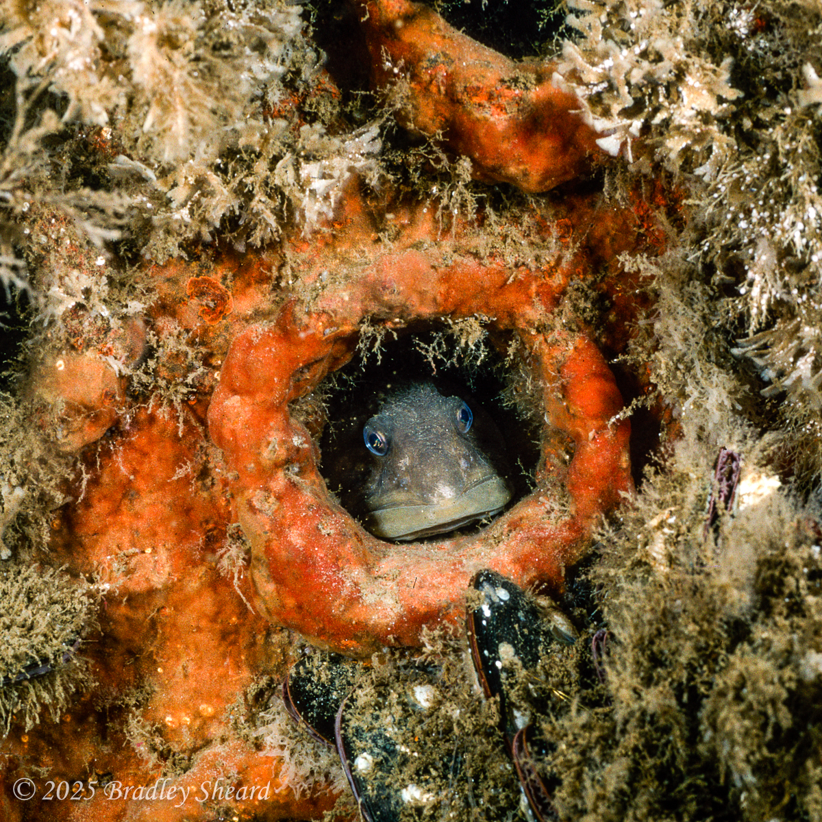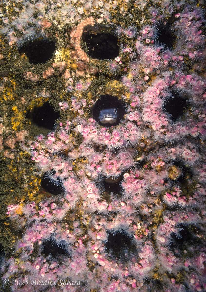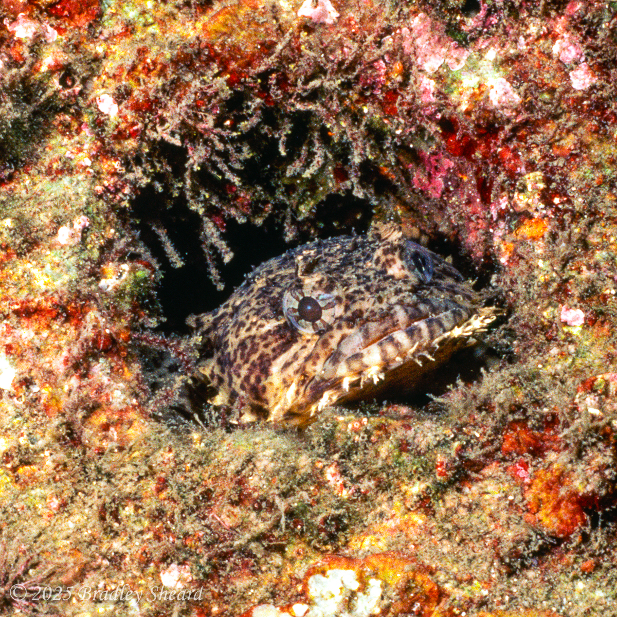 | eel and soft coral, Mexicano (September 1994, film) | tiny oyster toadfish, FW Abrams (June 2022, digital) | blennie, FW Abrams (June 2022, digital) | crab, Mexicano (September 1994, film) |