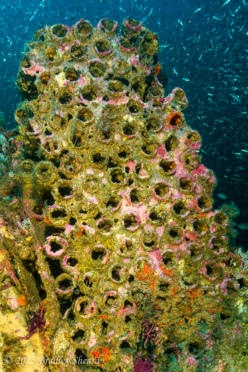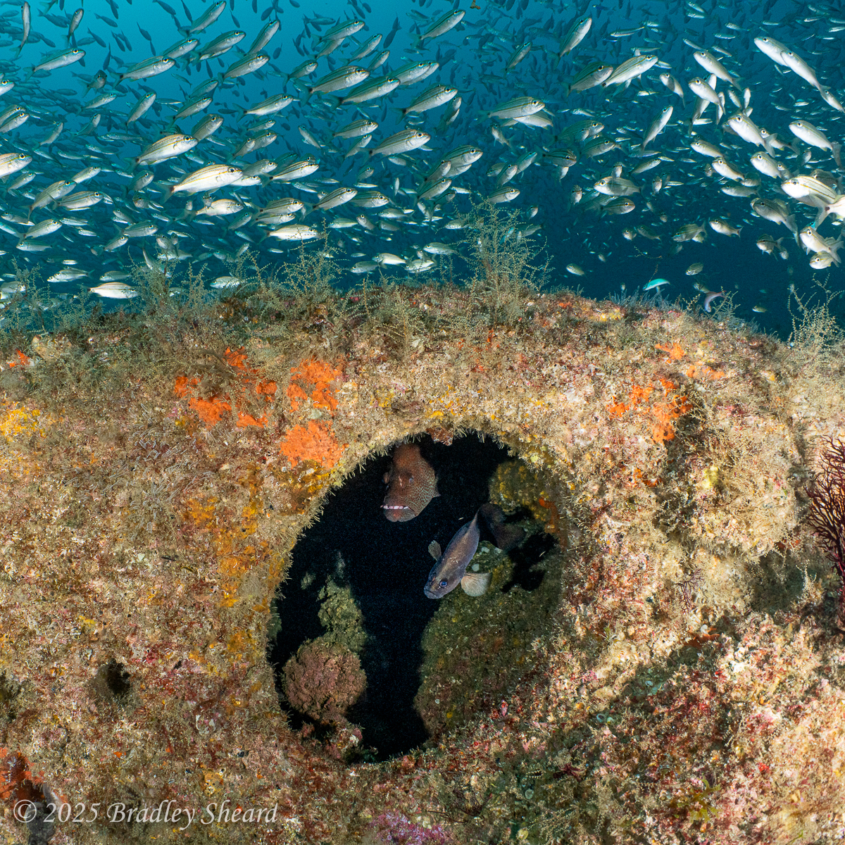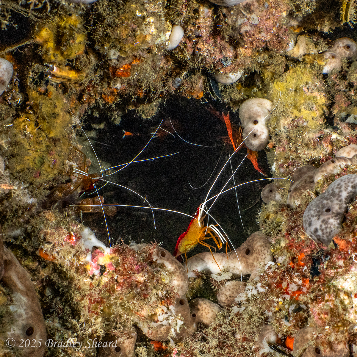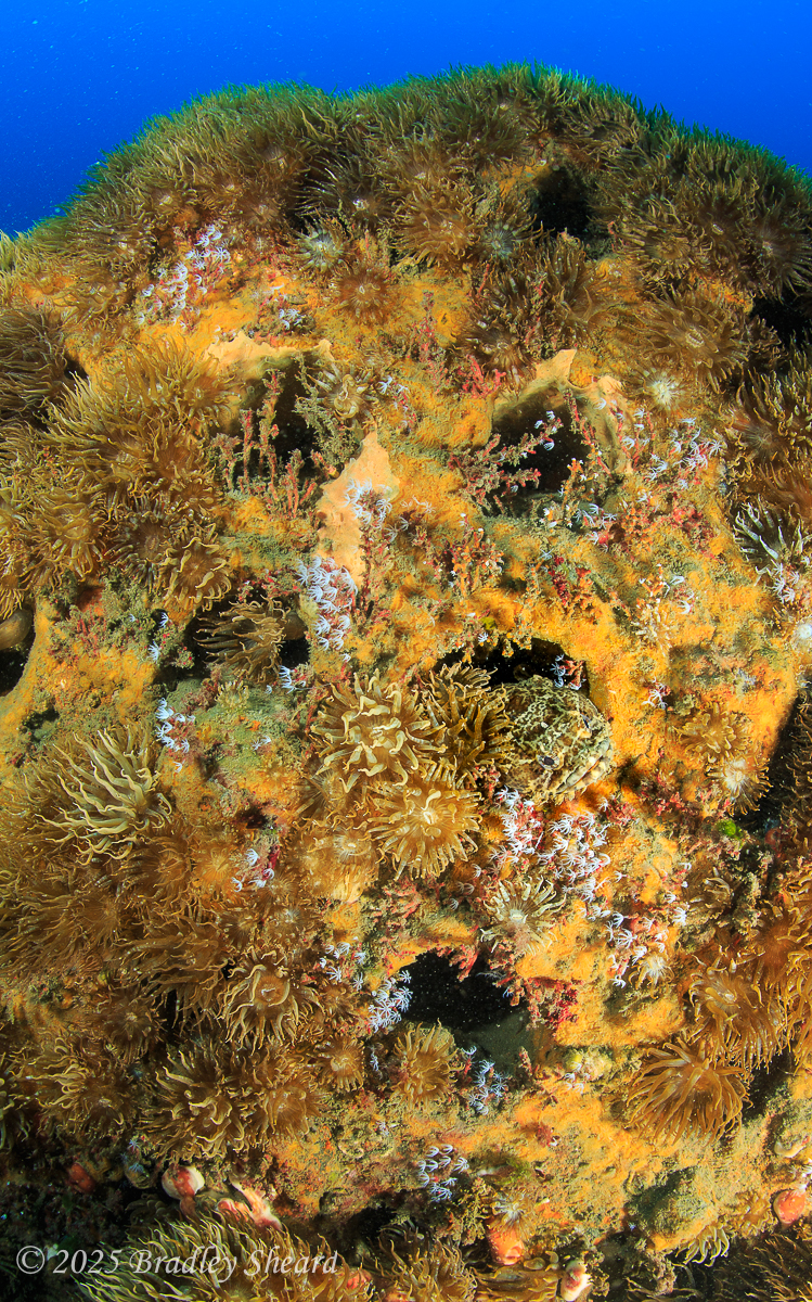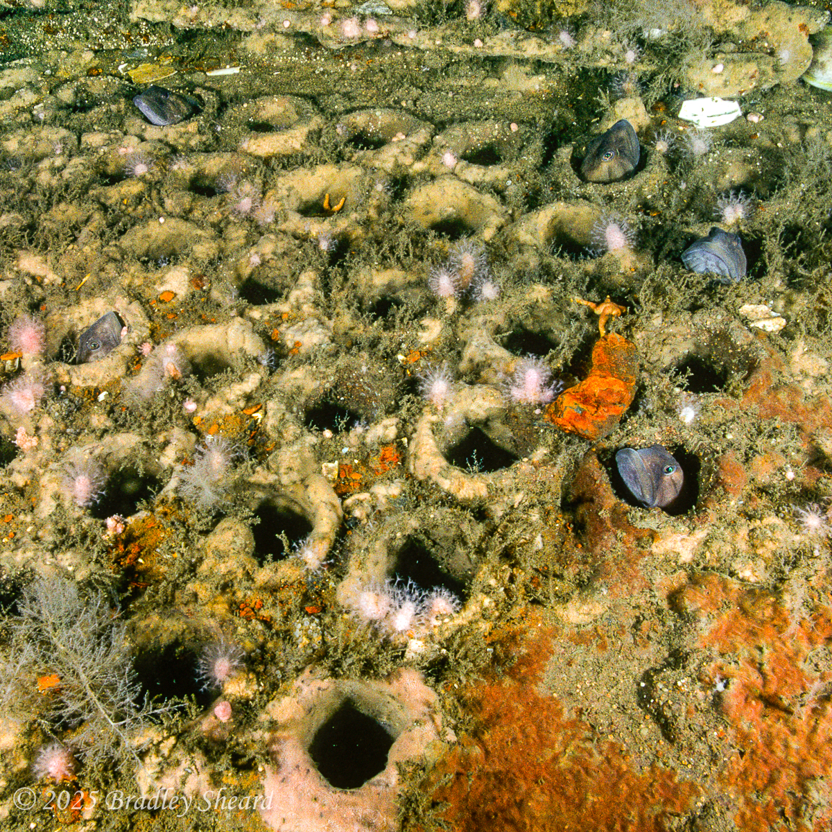 | eel and soft coral, Mexicano (September 1994, film) | tiny oyster toadfish, FW Abrams (June 2022, digital) | blennie, FW Abrams (June 2022, digital) | crab, Mexicano (September 1994, film) |