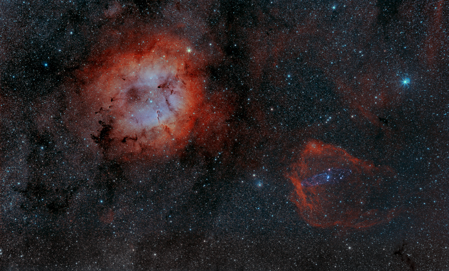 An expanse of sky stretching across the bottom of the constellation Cepheus. Included is the Elephant Trunk Nebula inside IC1396 (upper left) and the much fainter Flying Bat Nebula (Sharpless 2-129, lower right), both emission nebula rich in ionized hydrogen. The image was shot entirely through narrowband filters; the H-alpha taken from light-polluted Maryland, while the Oxygen III frames were taken from Cape Hatteras, North Carolina, where the skies are considerably darker. Faintly visible inside the red Sharpless 2-129 at lower right is the very dim Squid Nebula (Ou4), which appears as an elongated ghost of teal in the shape of a squid. The Squid Nebula was only discovered in 2011 by Nicolas Outters. The image is a composite of 20 hours of exposure, my longest effort yet. My goal was to try and capture the faint squid, which I did, although just barely! | |||
